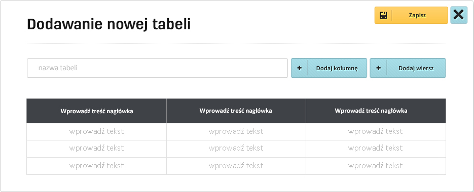Tabele można tworzyć z podziałem na dowolną ilość kolumn oraz wierszy wraz z ich indywidualnymi nazwami.