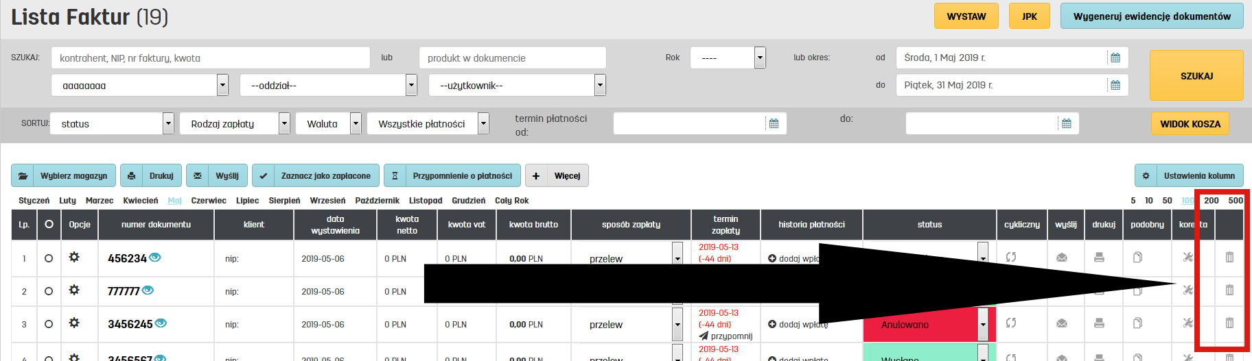 Aby usunąć dokument należy przejść do listy dokumentów, następnie kliknąć w ikonkę kosza w rzędzie dokumentu, który zamierzamy usunąć.