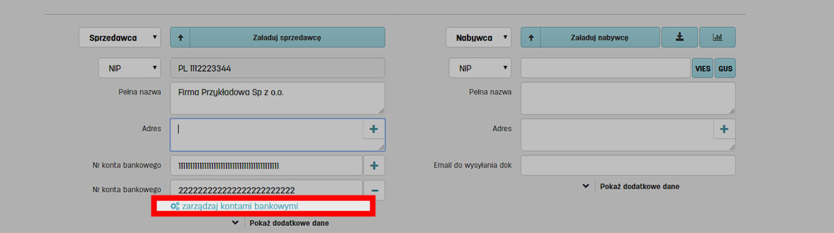 W sekcjii z danymi naszej firmy, pod polem Nr. konta bankowego znajduje się link zarządzaj kontami bankowymi.